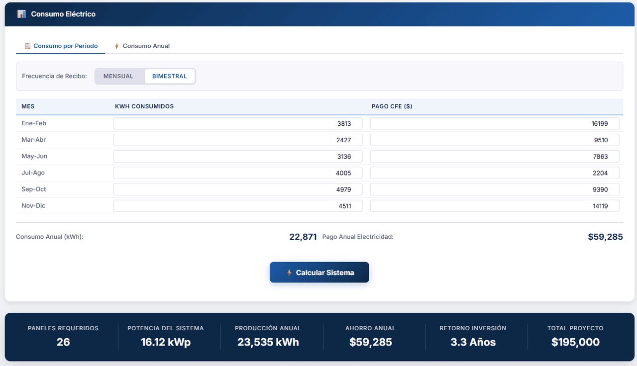 Introduce los datos energéticos y deja que el sistema calcule pagos, consumo y proyecciones sin hojas de cálculo.
