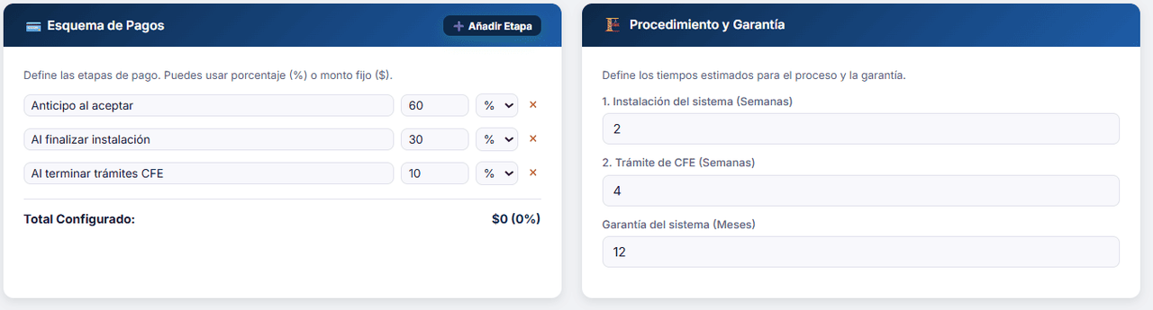 Personaliza financiamiento, condiciones comerciales y garantÃas para presentar propuestas claras y profesionales.