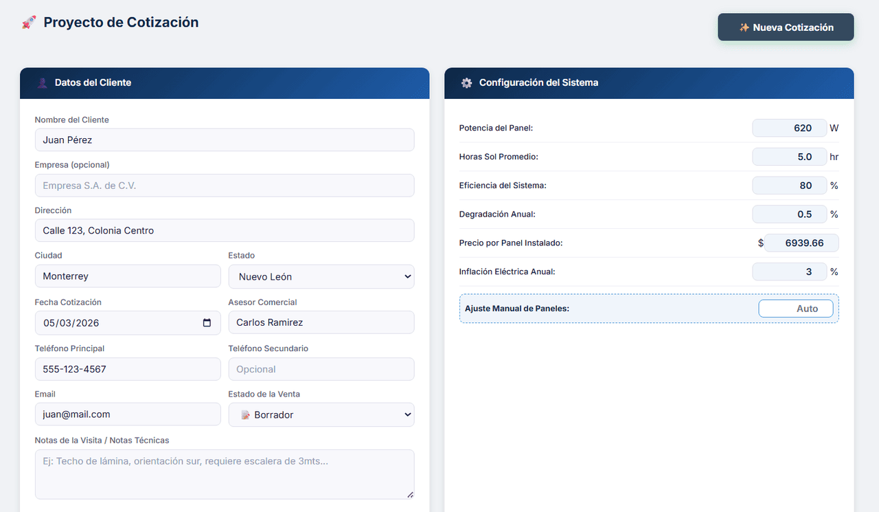 Ingresa los datos del cliente y define la configuración inicial del proyecto solar de forma rápida y organizada.